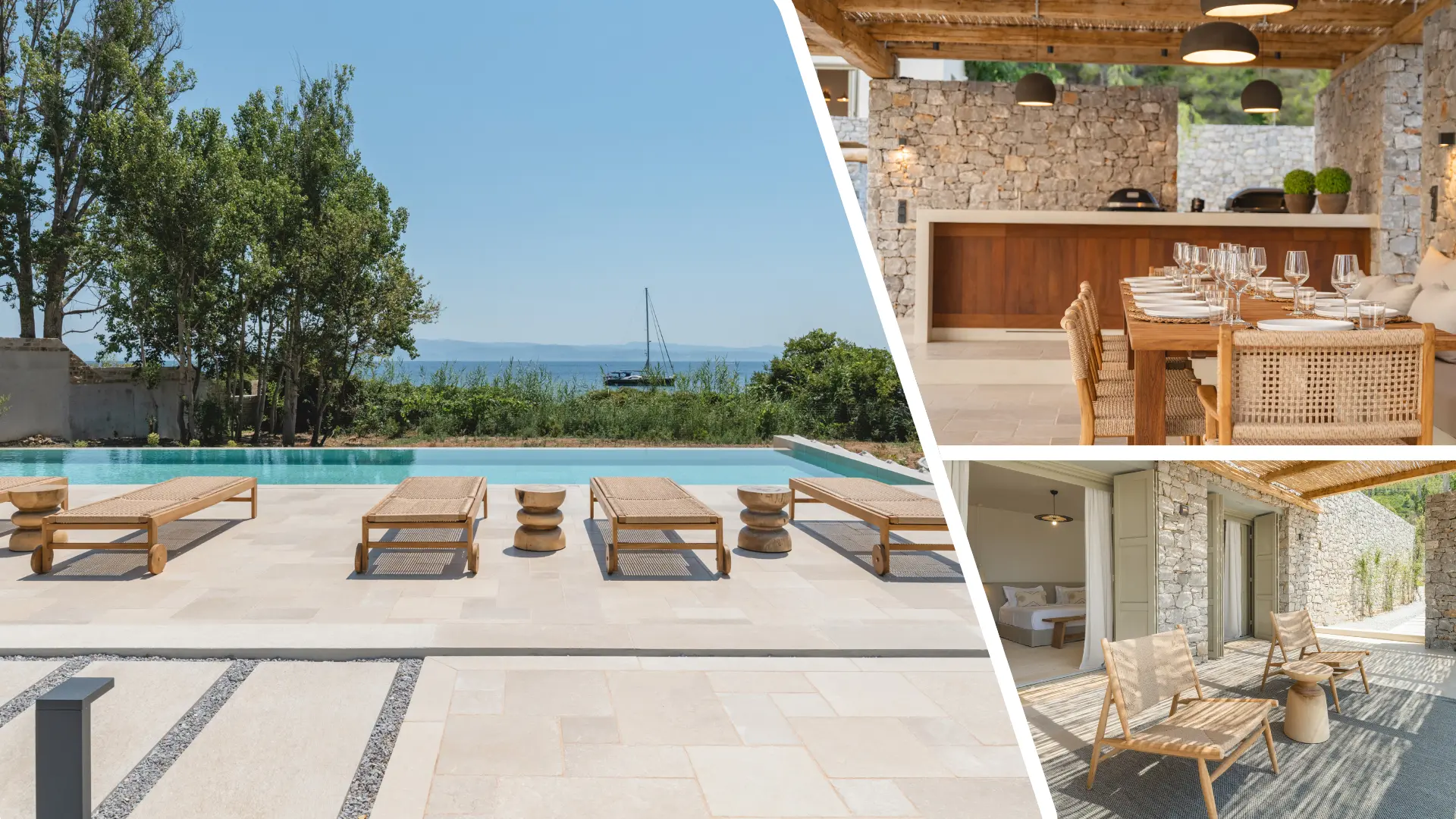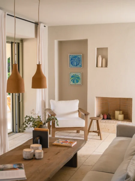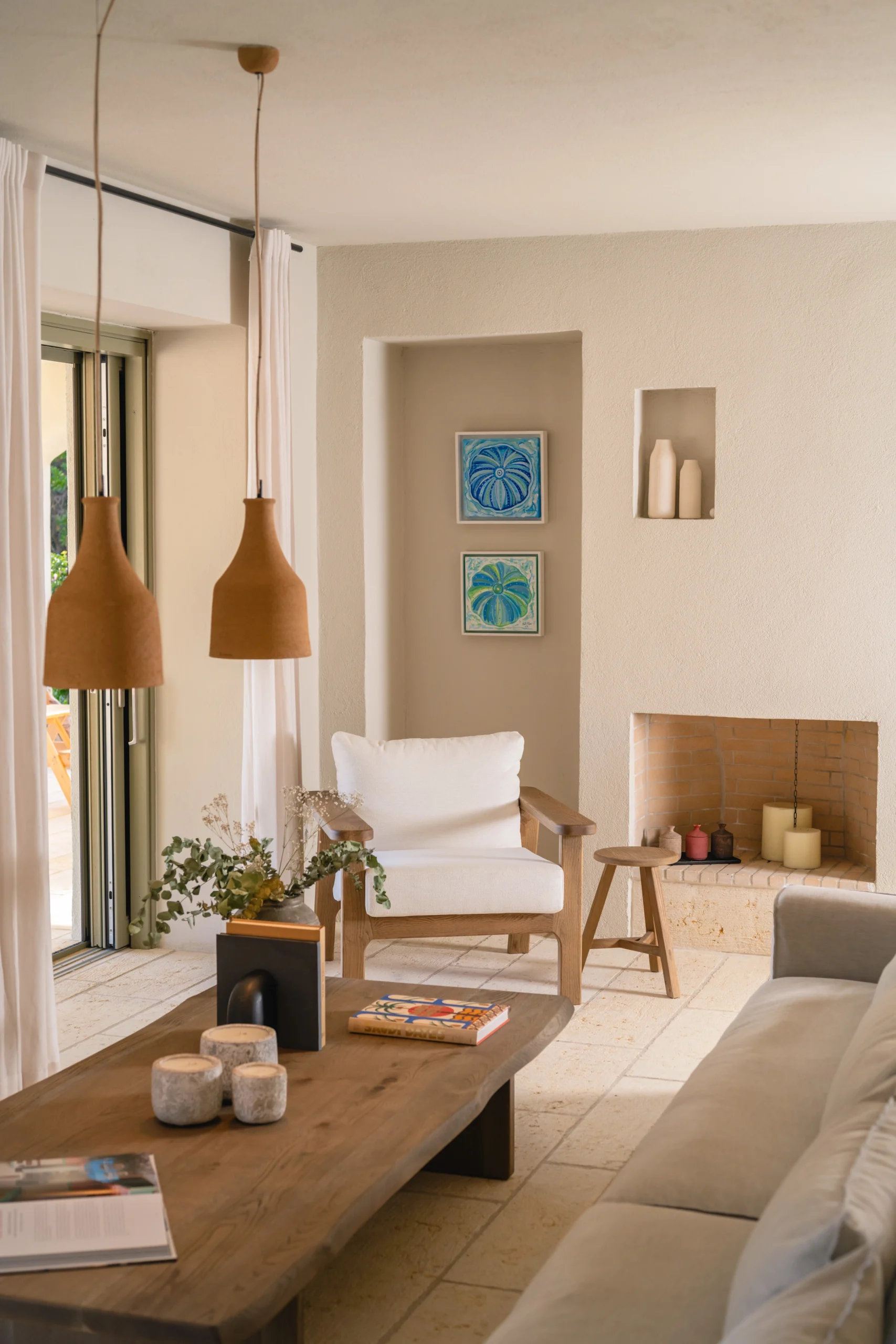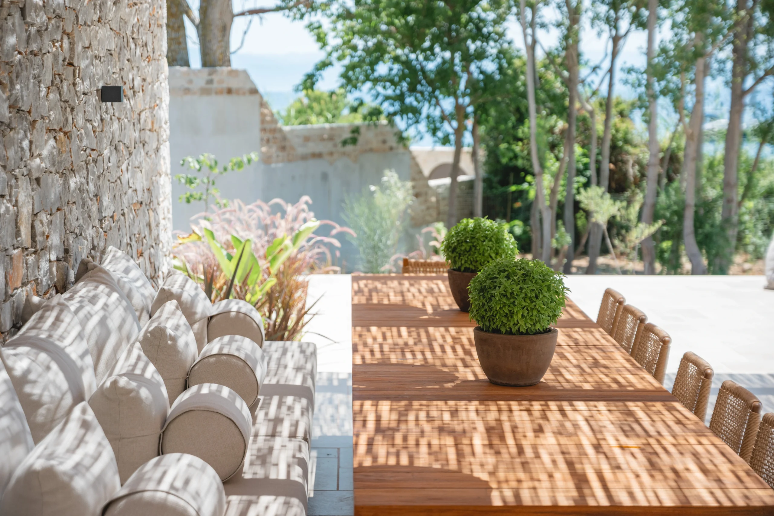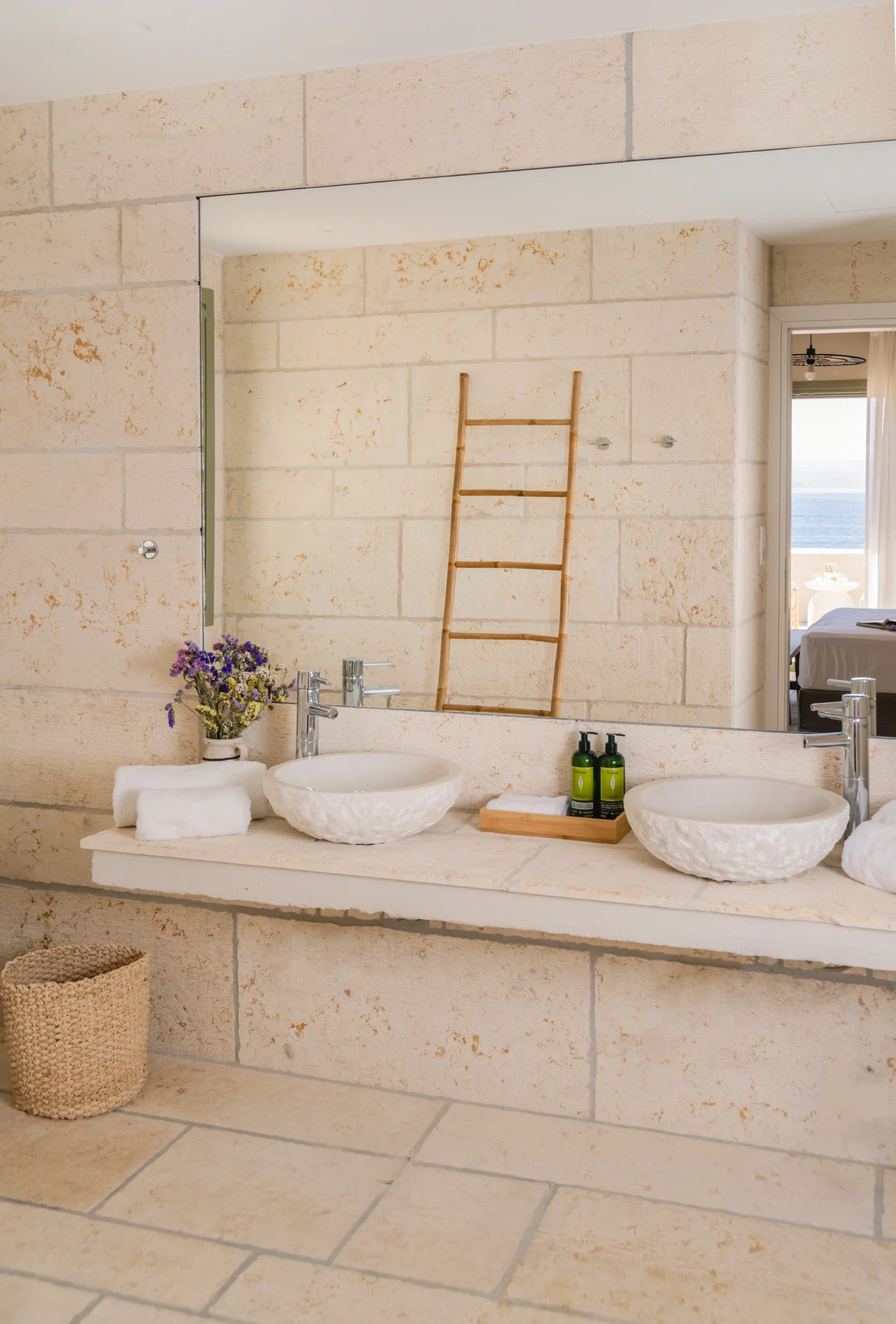 Natural stone, aged wood, linen, terracotta, and glass that reflects the sea.