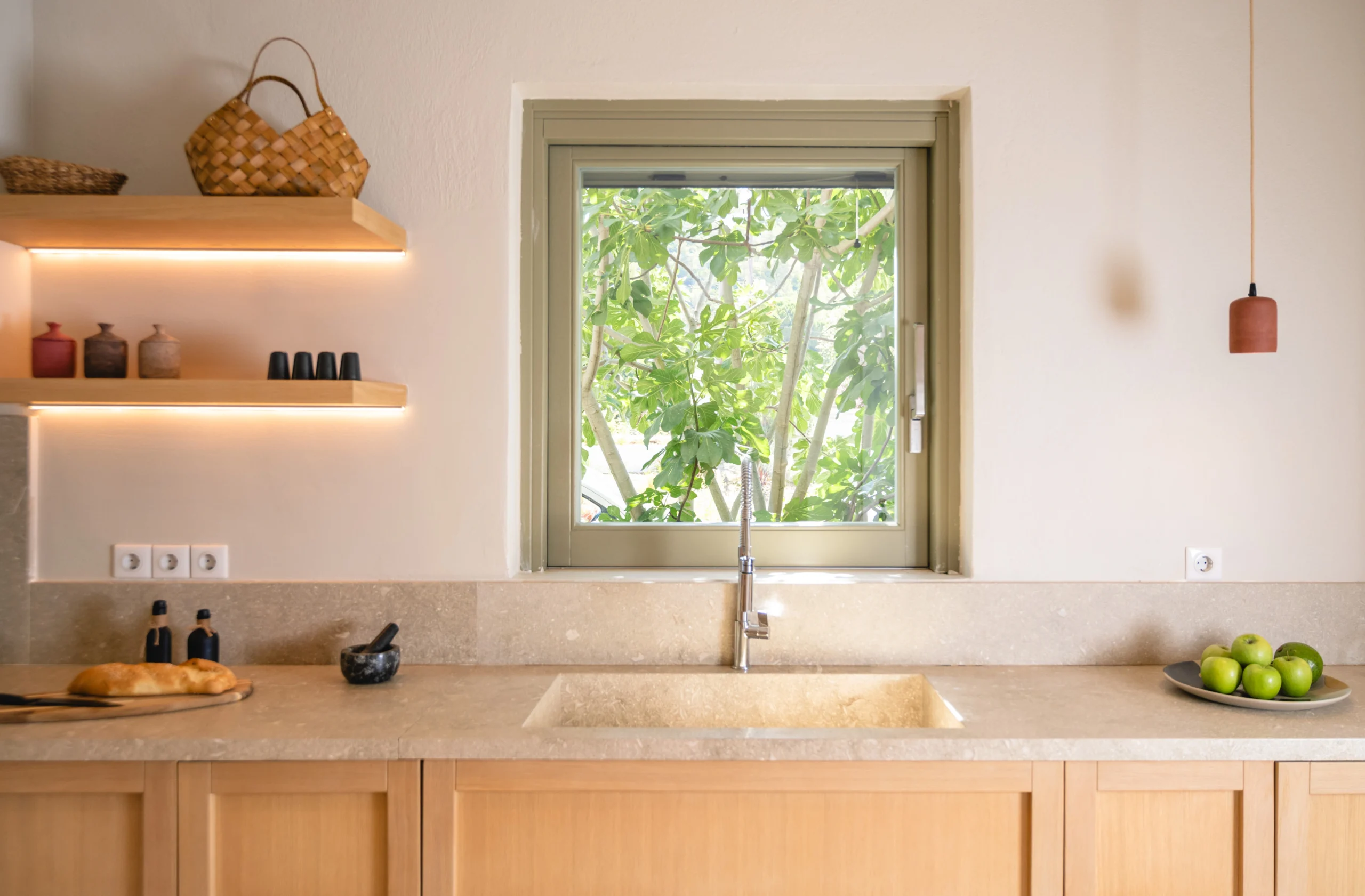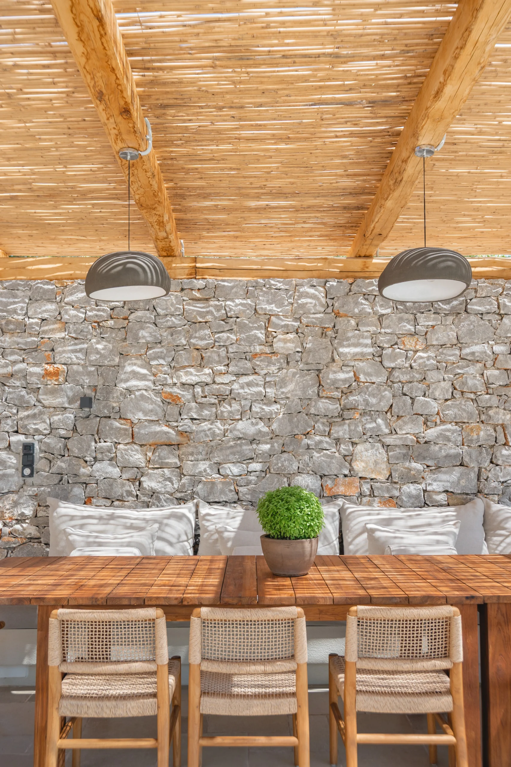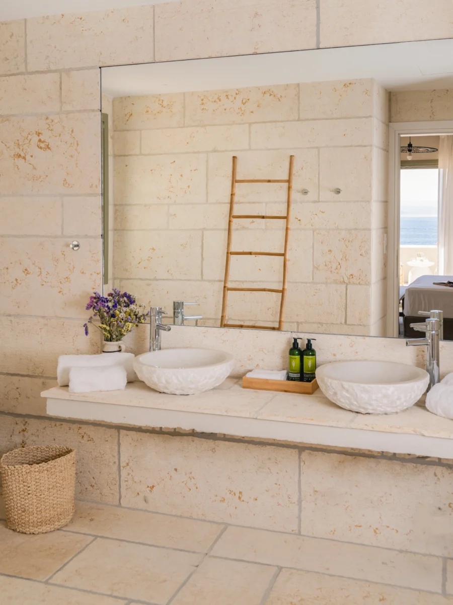 Natural stone, aged wood, linen, terracotta, and glass that reflects the sea.