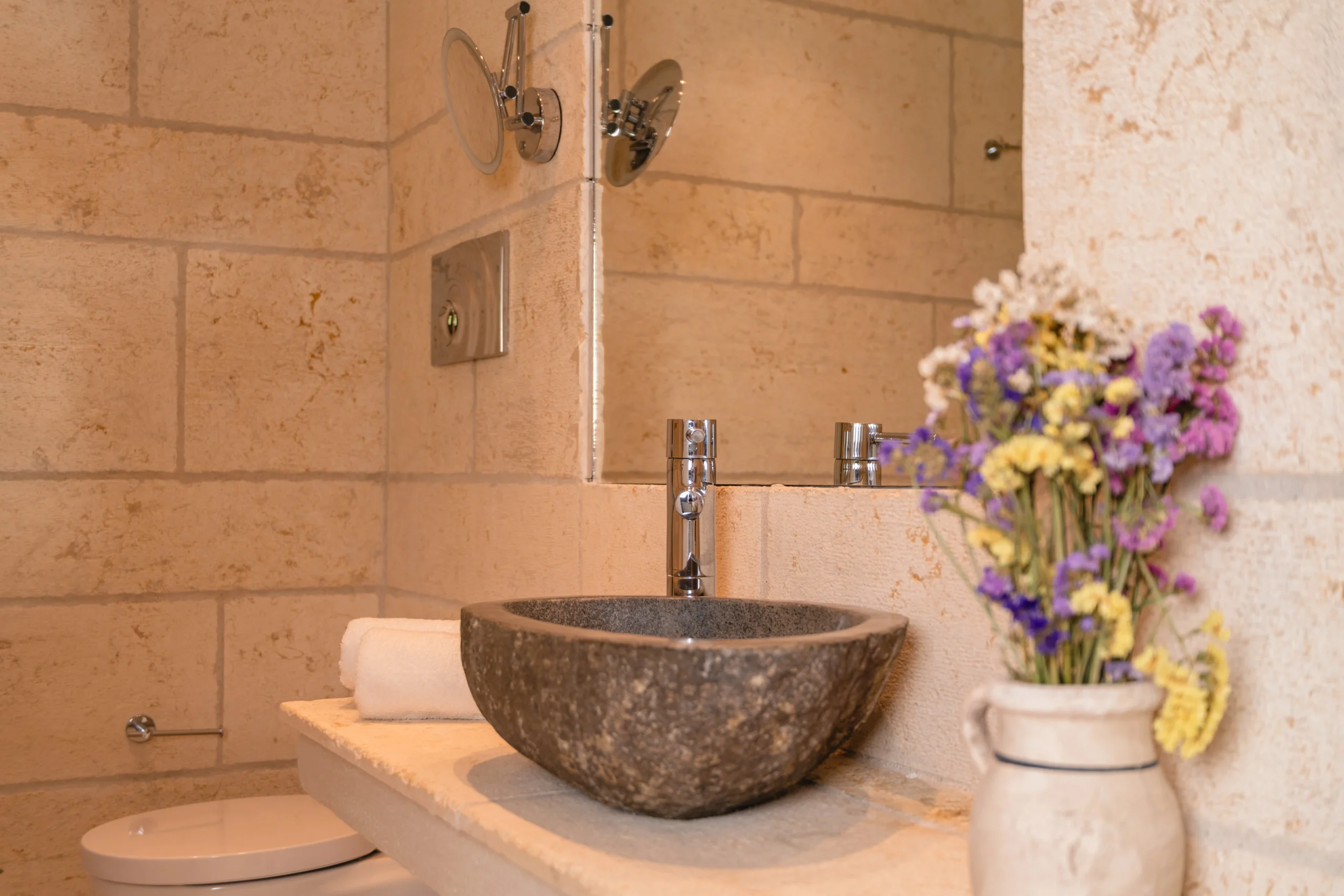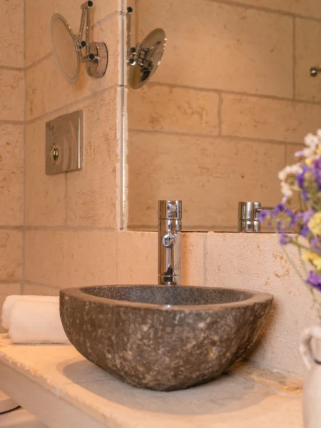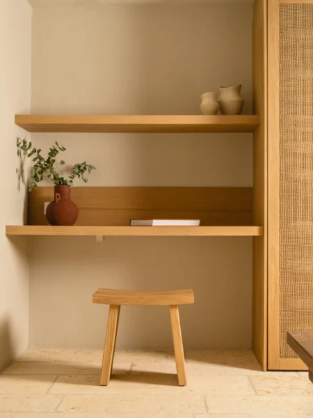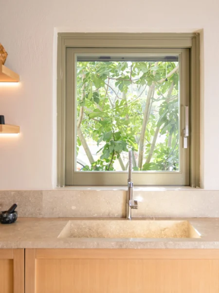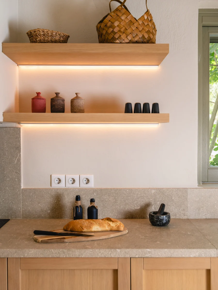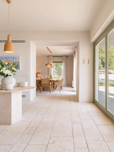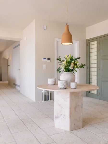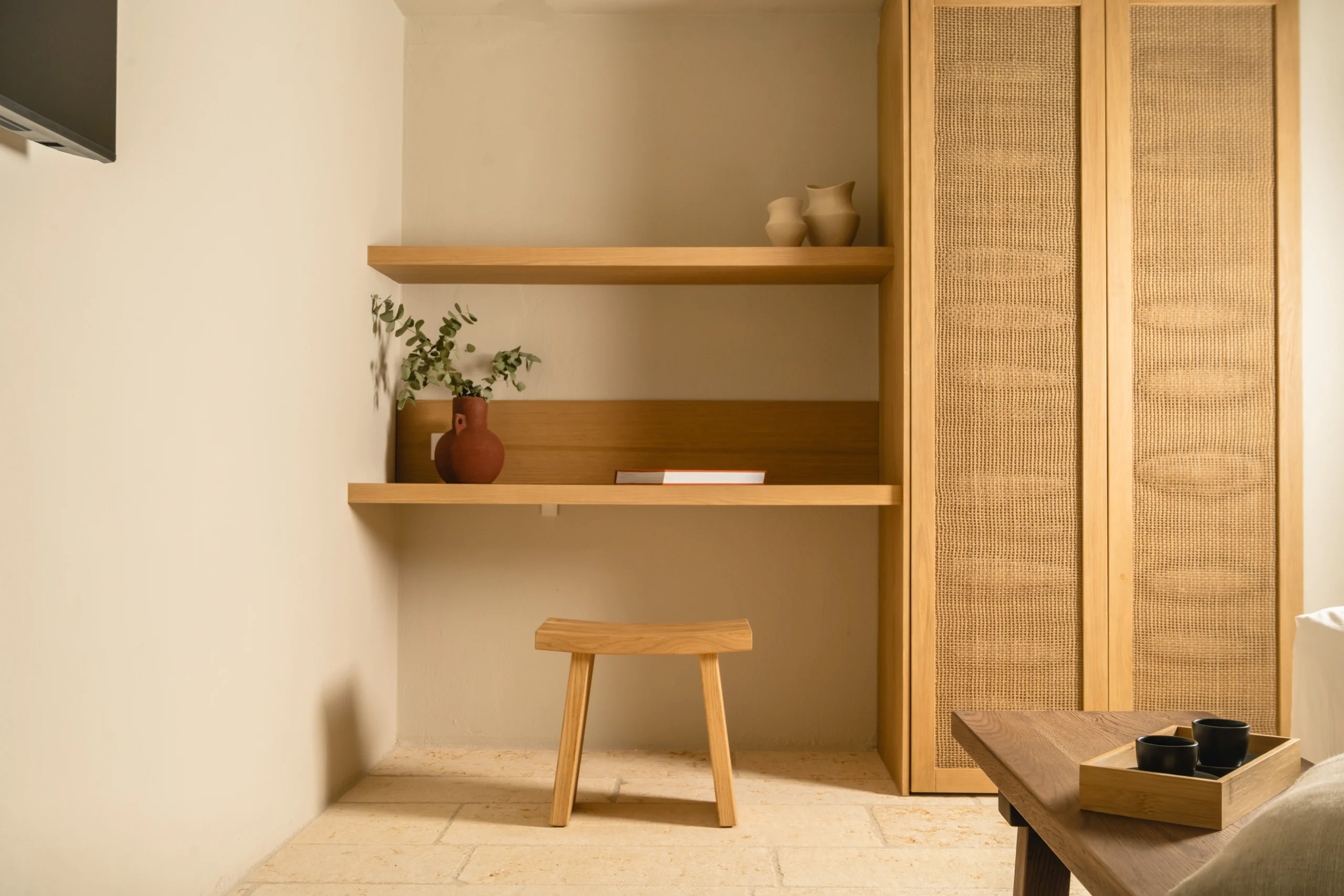 Natural stone, aged wood, linen, terracotta, and glass that reflects the sea.