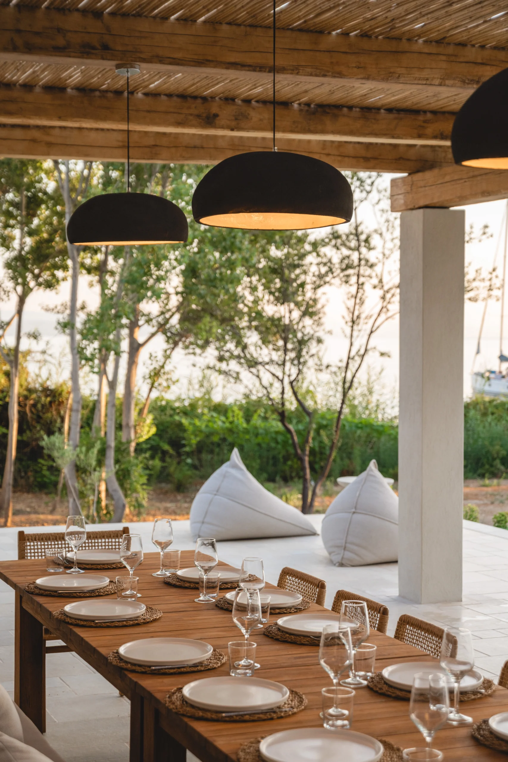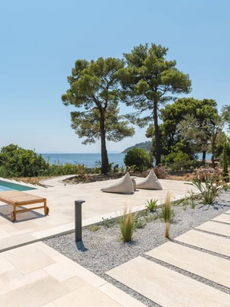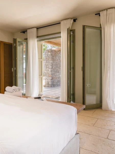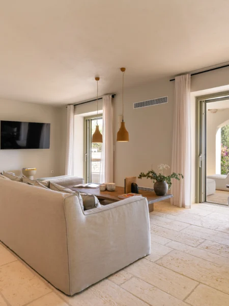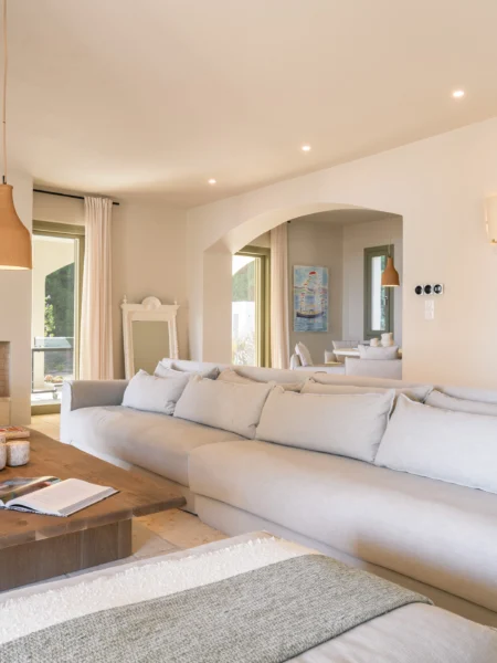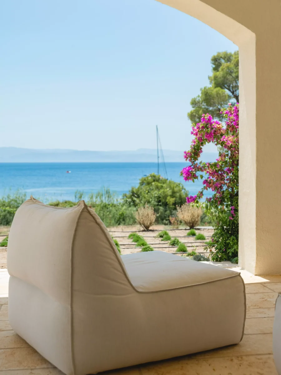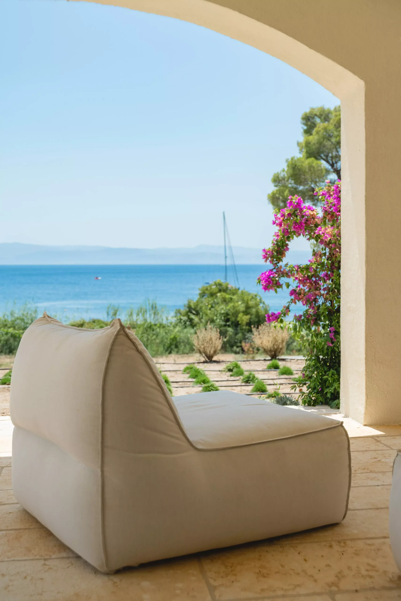 Crafted with smooth, organic lines and a palette of earthy tones, the villa blends seamlessly into its surroundings. Teak and iroko wood, natural stone, and linen textures create a tactile connection to the land. Every room opens to the infinite blue—where the view is a living painting, constantly shifting as sailboats, yachts, and fishing vessels glide across the horizon.