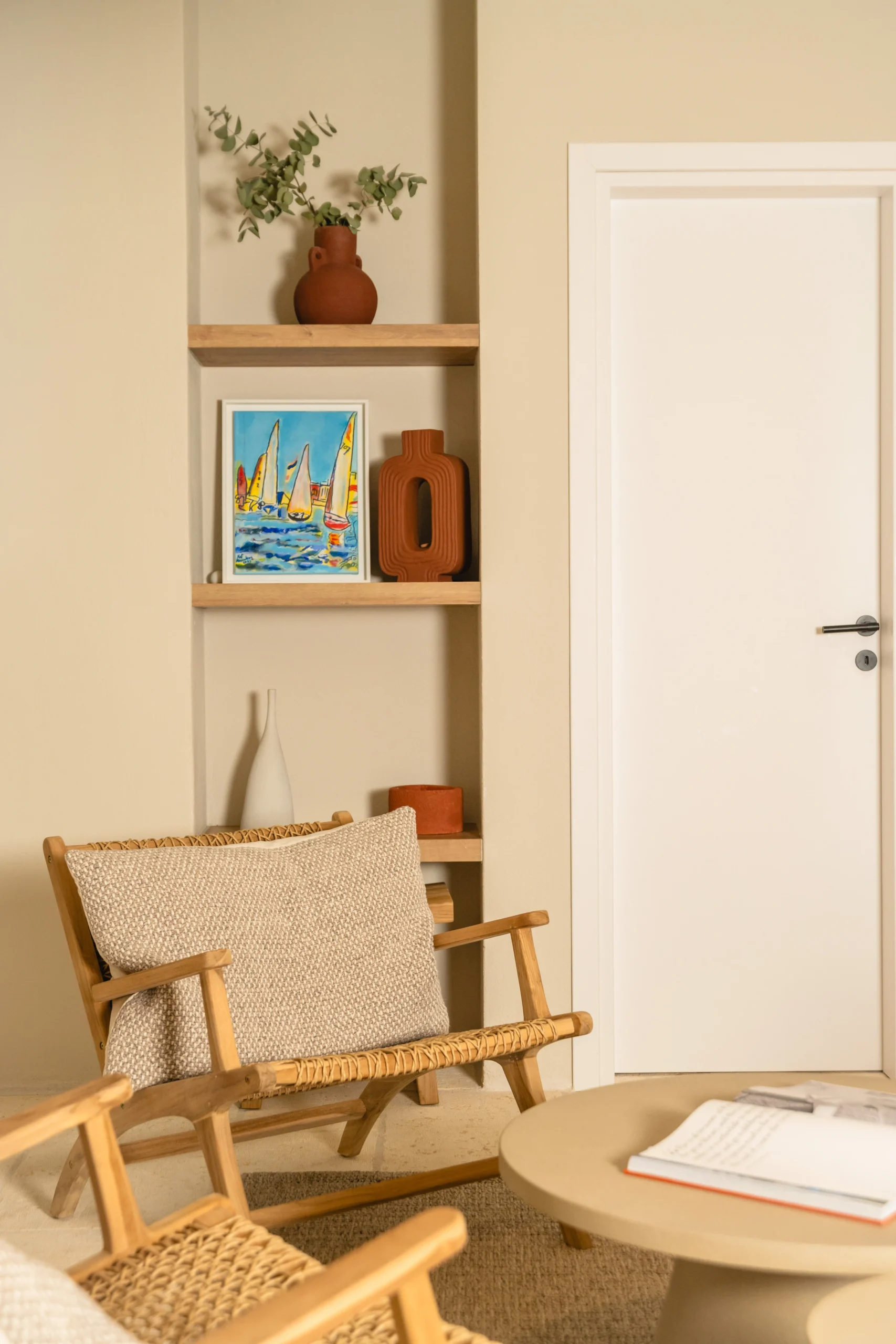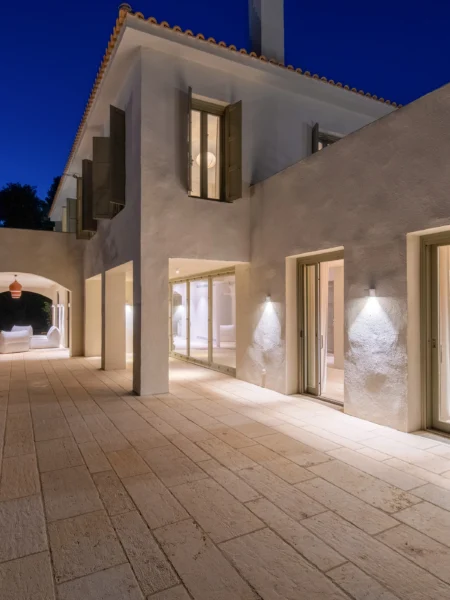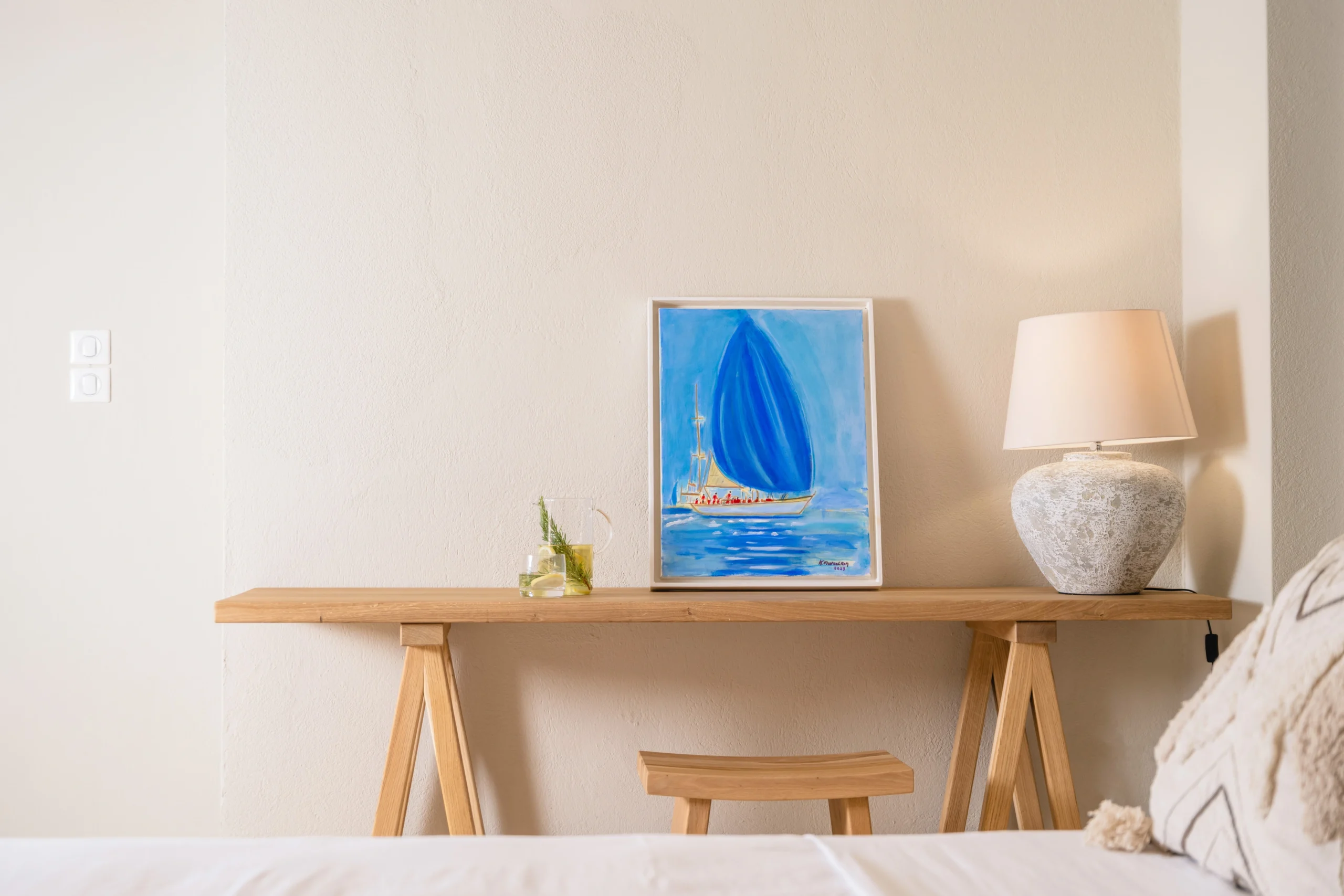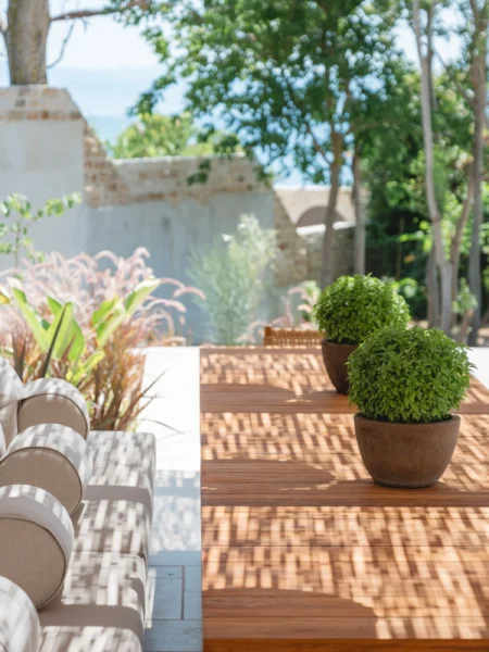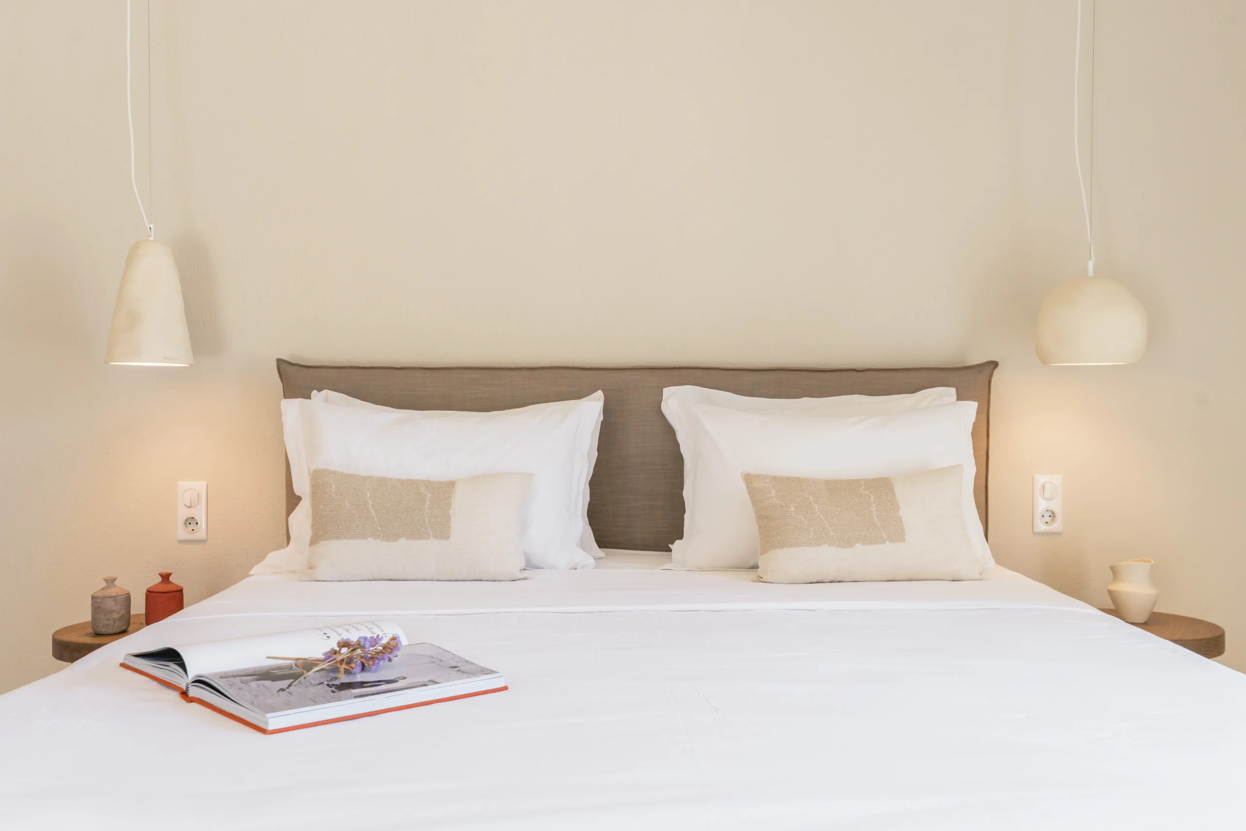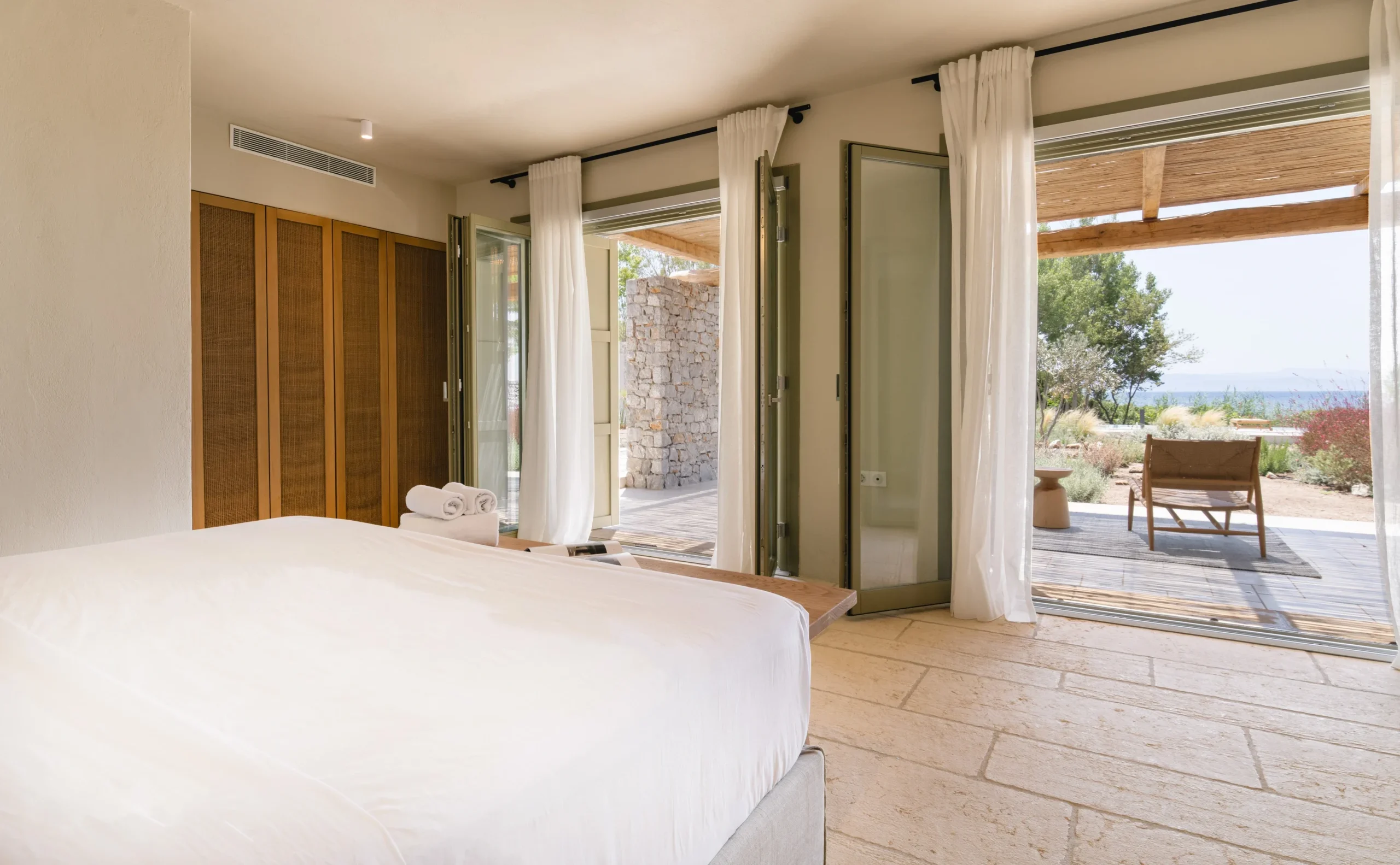 Crafted with smooth, organic lines and a palette of earthy tones, the villa blends seamlessly into its surroundings. Teak and iroko wood, natural stone, and linen textures create a tactile connection to the land. Every room opens to the infinite blue—where the view is a living painting, constantly shifting as sailboats, yachts, and fishing vessels glide across the horizon.