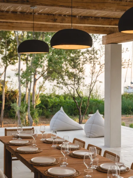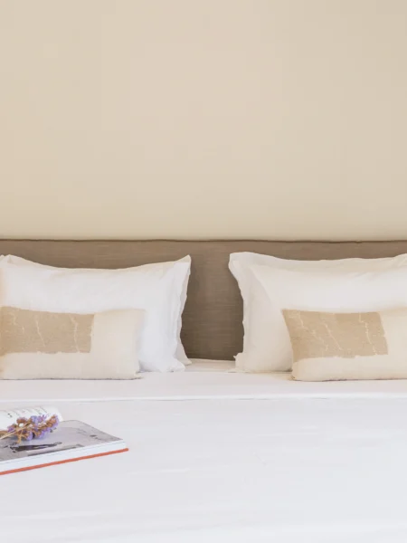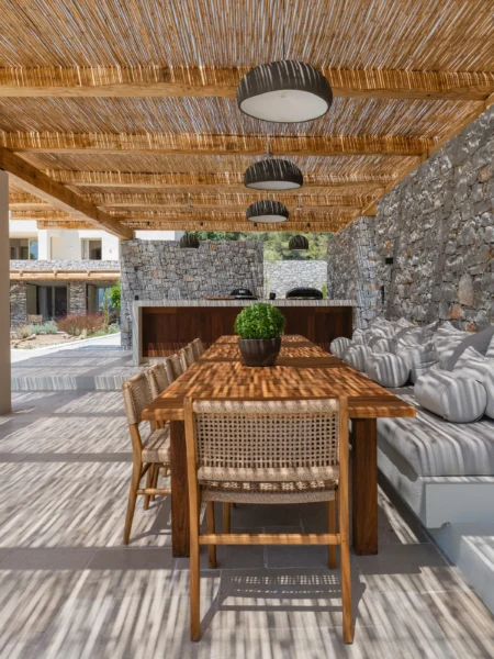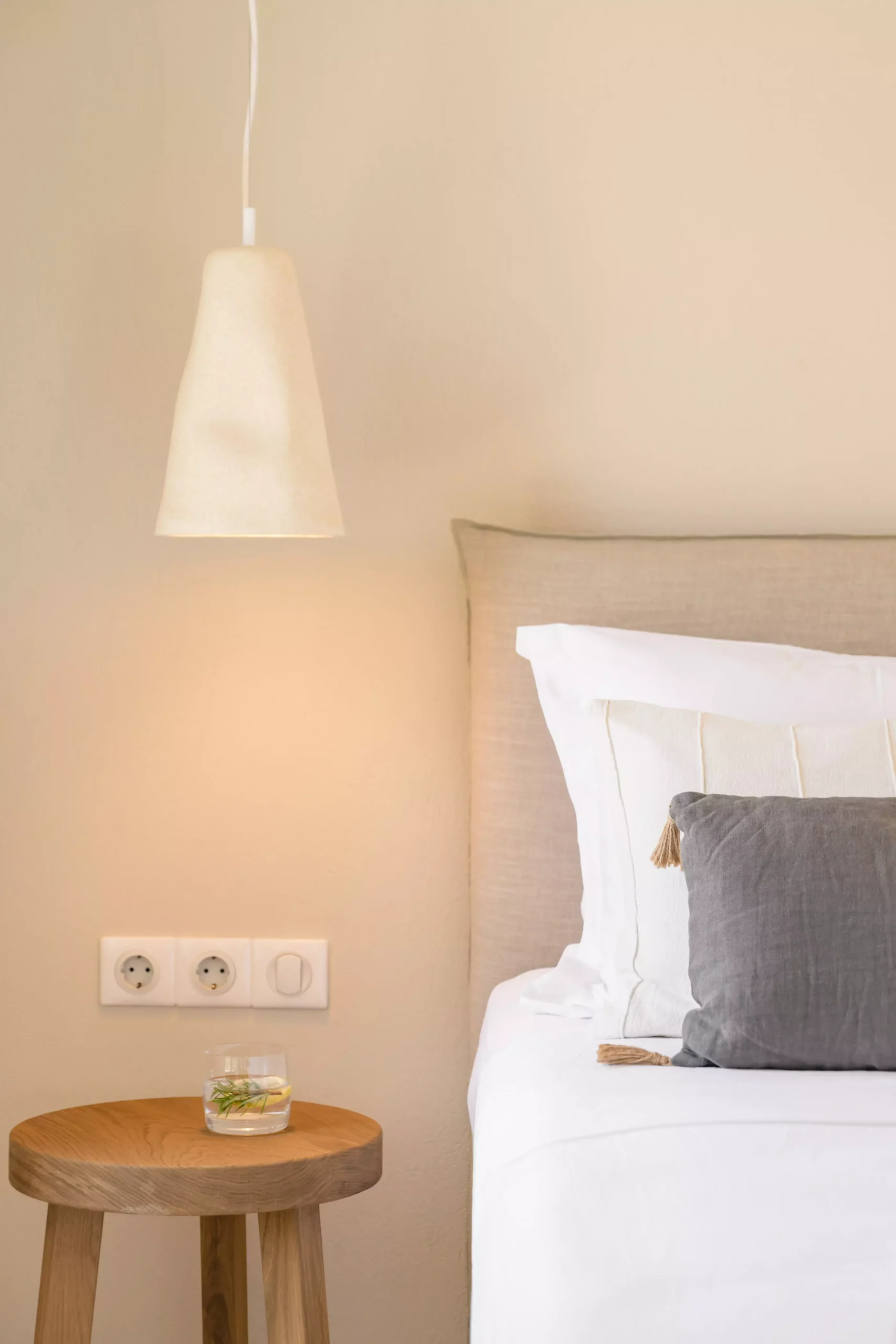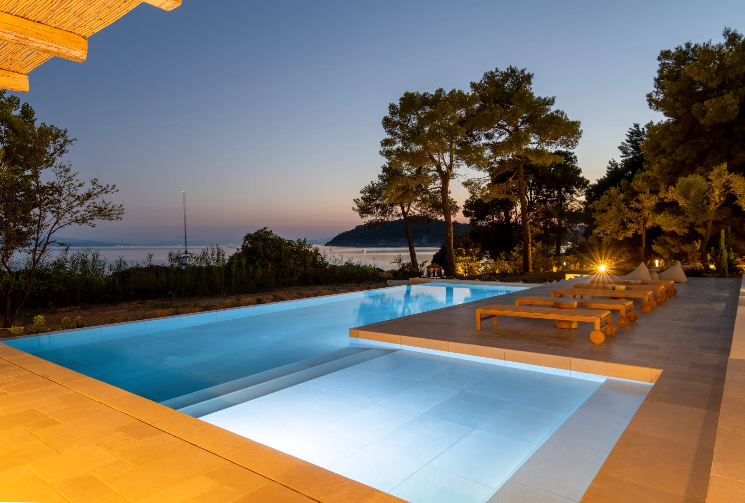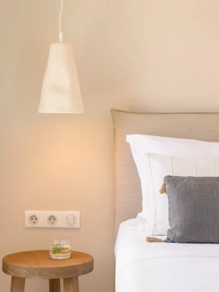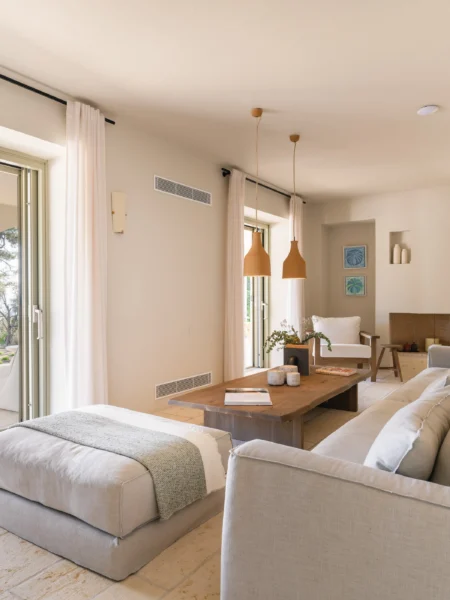Crafted with smooth, organic lines and a palette of earthy tones, the villa blends seamlessly into its surroundings. Teak and iroko wood, natural stone, and linen textures create a tactile connection to the land. Every room opens to the infinite blue—where the view is a living painting, constantly shifting as sailboats, yachts, and fishing vessels glide across the horizon.