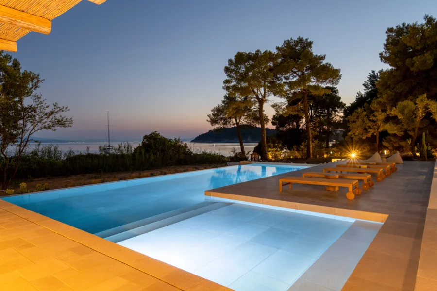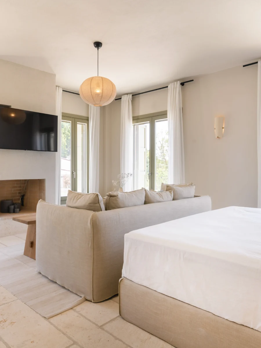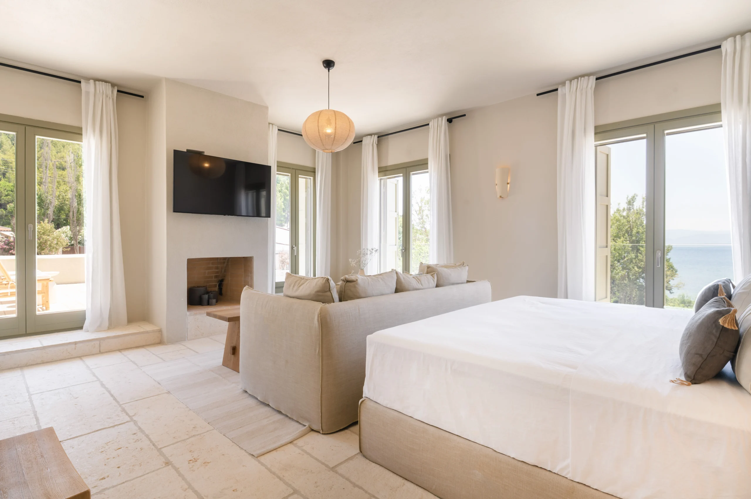Master Suite 1 (50 sq.m.): King-size bed(200 cm x 200 cm), fireplace, private lounge, office nook, walk-in closet, kitchenette, and a 50 sq.m. private veranda …with panoramic views of the sea and pool. Ensuite bathroom with refined finishes.