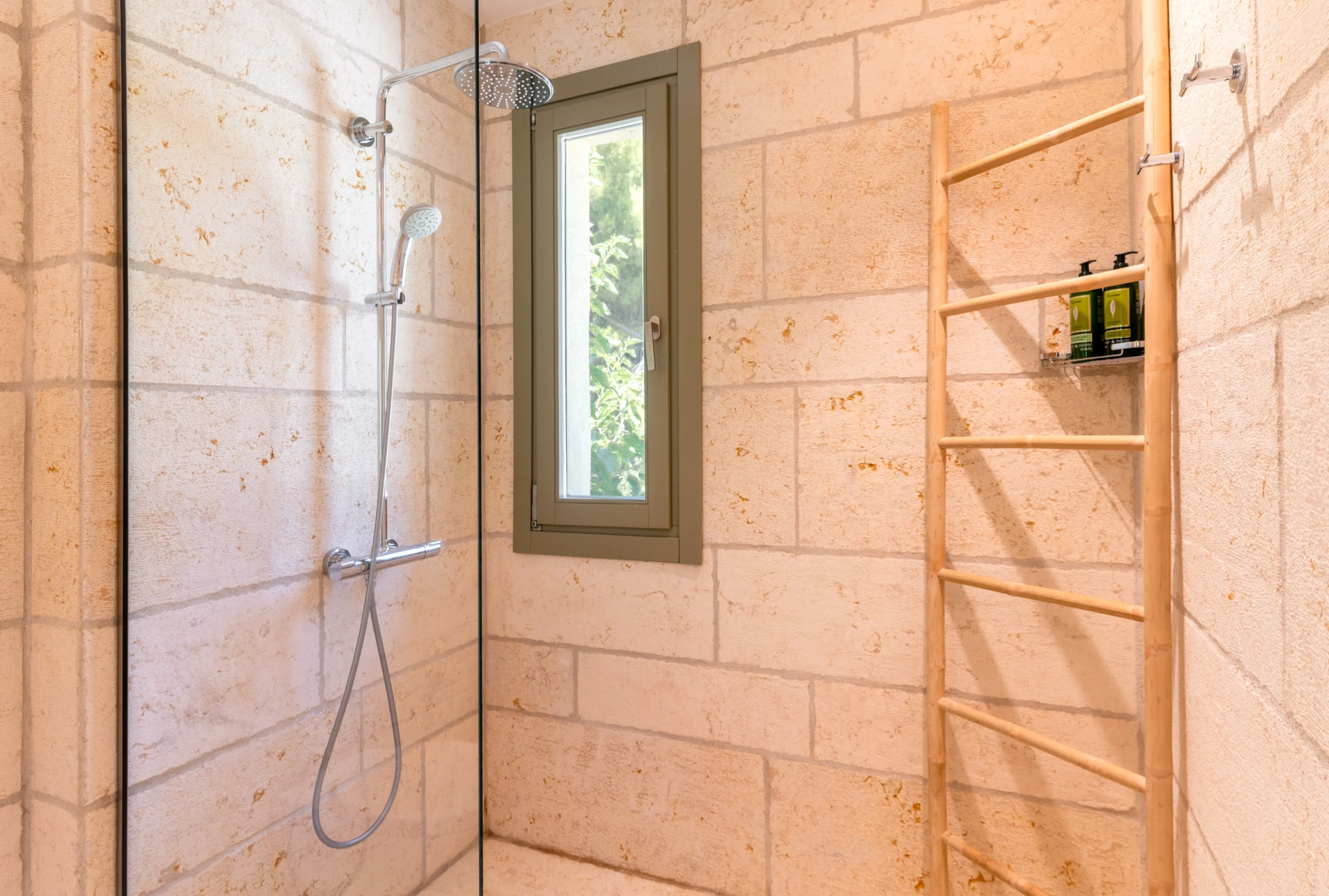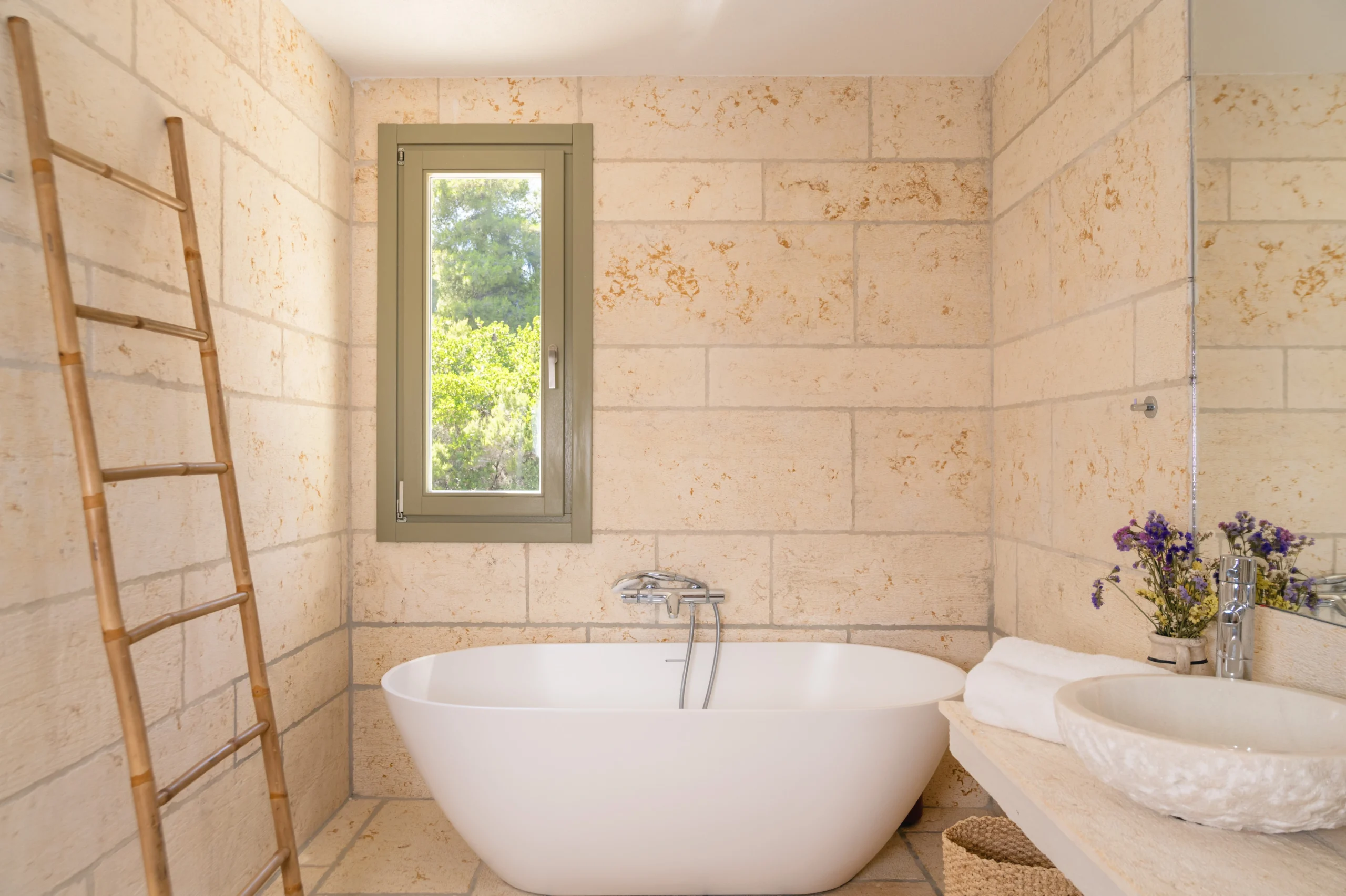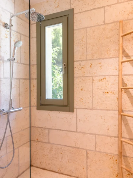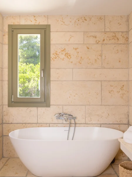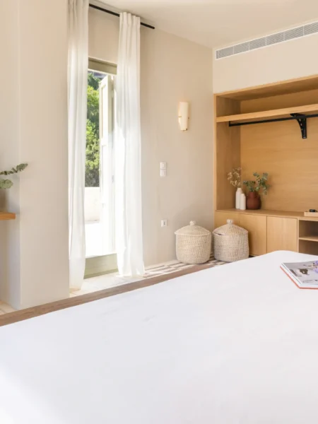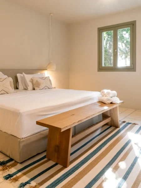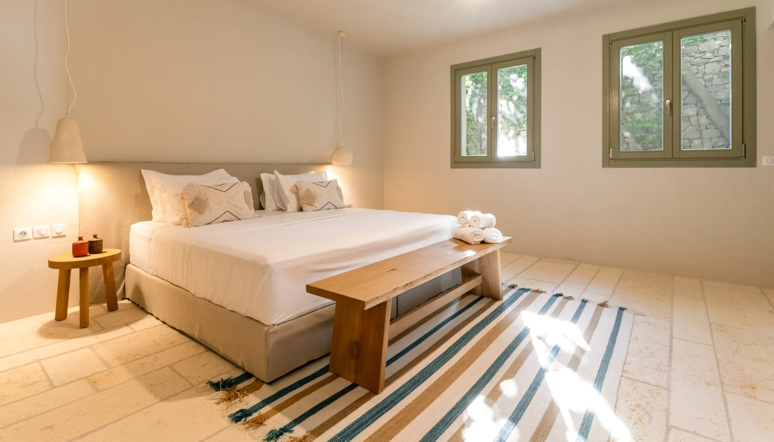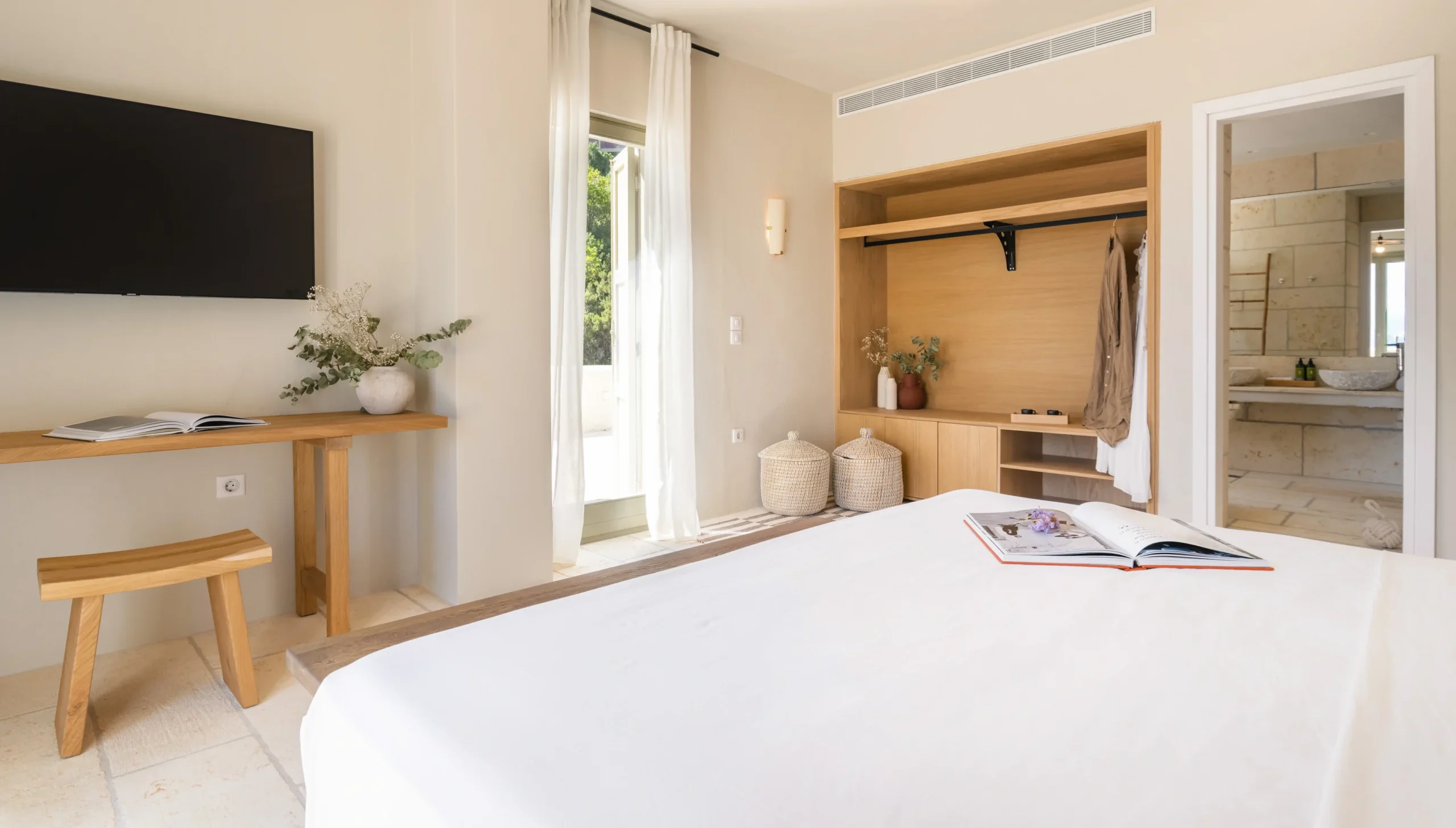 Master Suite 2 (50 sq.m.): Queen-size bed (180 cm x 200 cm), ensuite bathroom with separate tub and shower, office space, and access to a 70 sq.m. shared veranda overlooking the Aegean.